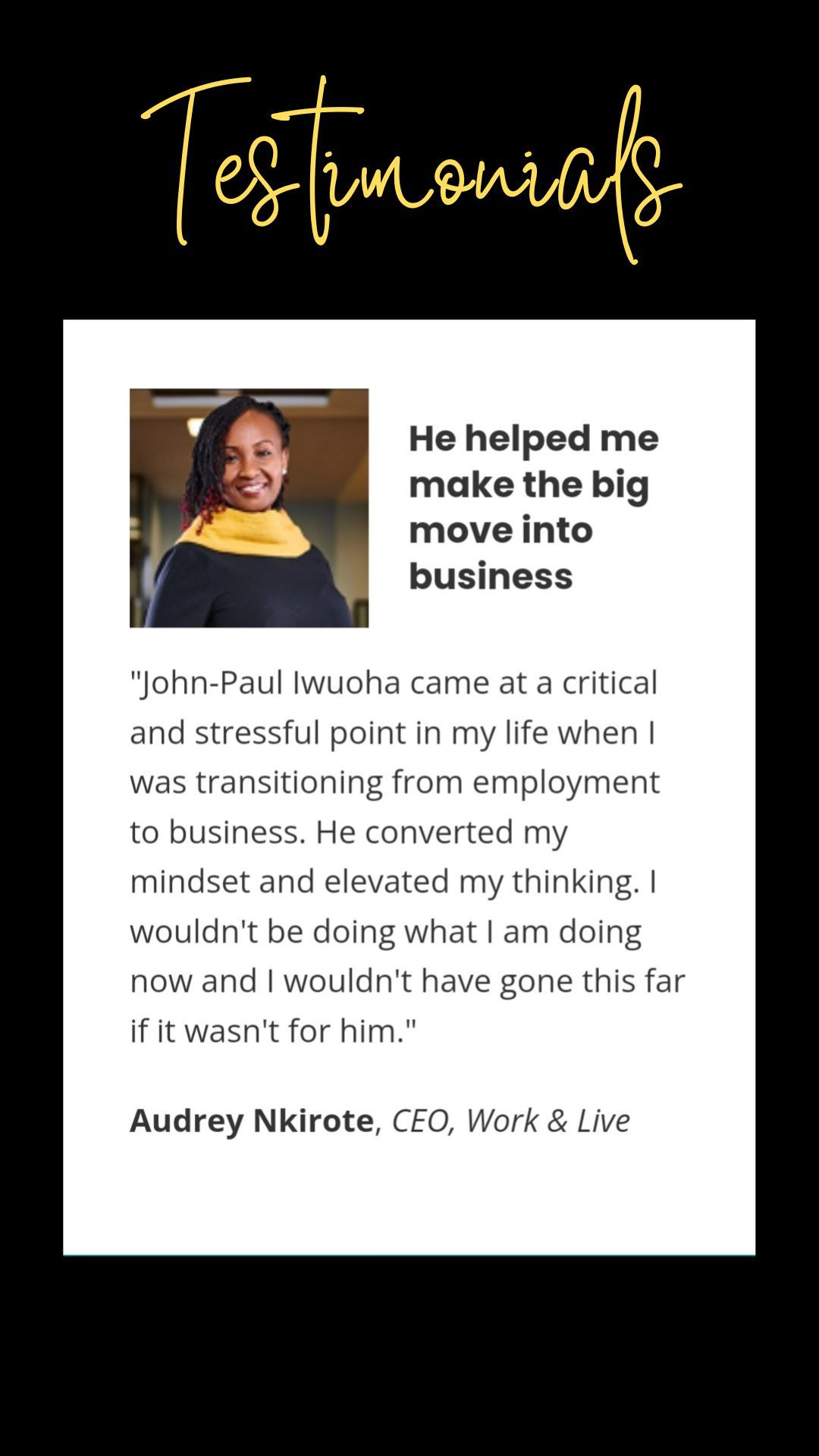 Whether you’re trying to start a new business, grow an existing business, or turn around a failing one, I created this platform for people like me who have a business dream and need help to cultivate and nurture it.